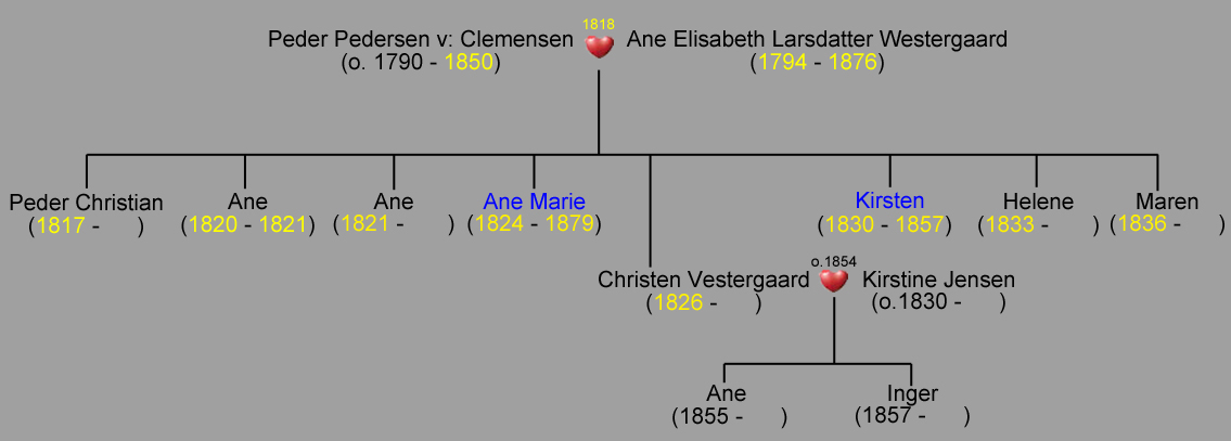 Få dage efter at folketællingen for 1850 er gennemført, den 6.februar, dør Peder Clemmensen, af 'Sindsforvirring med en pludselig død', 53 år gammel. To år efter, i 1853 ses i fattigprotokollen for første gang et notat, der vedrører 'Peder Clemmensens svage Datter Kirsten Pedersdatter', der tildeles en almisse på 4Tdr Byg og 12Rbdl. Det viser sig kort tid efter, at ikke blot datteren Kirsten, men også hendes seks år ældre står i kirkebogen søster, Ane Marie, er belastet af sygdom. Hvad de to søstre helt præcis lider af, fremgår ikke af det nedskrevne, men i et af de mange følgende notater i fattigprotokollen omtales de som 'Peder Clemmensens tvende sindssyge Døttre', og de kommer begge til at leve som almisselemmer resten af deres dage. I 1855 ses de igen i folketællingen: